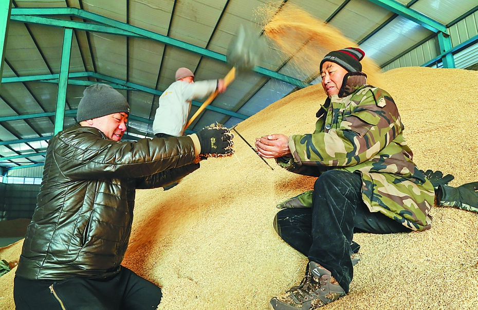 克东县宝泉镇富民生态农业合作联社在县乡有关部门扶持下,投资890多万元,引进不勒稻米加工生产线,建设稻米加工厂,日加工能力达到150吨,2016年除合作社打的5000吨水稻外,还收购5万吨水稻,满足加工厂的原料需求。图为合作社社员正在卸下稻谷准备加工。 黄洋本报记者姚建平摄