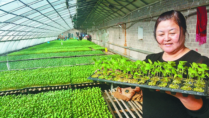 □文/摄本报记者吴树江 2月3日,立春。走进宁安农场生态园区1号温室大棚,门口1.5米高的排风扇正呼呼地转着,冒出团团的热气,推开大棚的两道门,一派生机盎然的春意扑面而来。职工们正在育苗托盘上,小心翼翼地挑选、摆放幼苗……这道工序是让长出的蔬菜苗更加均匀。 在宁安农场黑龙江北大荒绿旺蔬菜有限公司,记者见到被职工尊称为宋老师的技术员宋文静,她之前多次到山东学习先进的蔬菜种植技术,回到农场根据当地特点潜心研究温室大棚栽培技术。自2008年宁安农场聘请宋老师作为技术员,8年来,她的科技育苗不但为农场带来了很好的经济效益,还培养出一批又一批育苗人才,如今他们都已经成为基层作业站上的骨干。 在育苗平台旁,宋老师端起一个长满小苗的托盘,从穴巢里拔出一株小苗展示给记者看:“这个穴盘里的基质是从荷兰进口,从天津港直接发过来,160元一包的基质能装400多个穴盘。特点是不伤根,育出的苗根系发达,非常壮实。”说着话,宋老师蹲下身,掀开基质堆上的塑料布,熟练地把基质装进穴盘,拿起压穴器在托盘上一压,均匀的蜂窝式小巢立刻呈现出来,种子撒入即可,省工、省时、省力。 在一排排绿油油的育苗盘里,插着醒目的粉红色小标牌,上面详实地记录着种植信息:天龙茄子接穗(1月5日56盘)、泡椒乔治白(1月25日209盘15048株)、甜椒玛索红(2016年12月30日14盘)……“今年大棚育苗共有10多个蔬菜品种。3月10日、4月10日就可以分批出苗了。”宋老师说,在大棚里,客户需要啥品种,我们就能育出啥苗。大棚里的温度必须精准控制,白天温度能达到零上摄氏28度至30度,夜间也在15度左右。有温差的果蔬口感好。采用工厂式育苗在全省也是第一家。今年的代育苗订单应接不暇,辐射到哈尔滨、牡丹江等地。去年公司在当地农委申请到了新技术推广项目,国家匹配资金22万元,建设了三栋温室大棚,育苗40多万棵,市场销售价每株秧苗0.4元,嫁接育苗每株0.7元,效益达到了30多万元。今年我们再增加三栋大棚,并已申请工厂育苗的大项目,这样一年的效益能达到100万元。 “撸起袖子加油干。”宁安农场场长王洪斌自信满满地告诉记者:2017年是宁安农场建场70周年。在蔬菜大棚的带动下,农场“种子+经济作物”高效种植格局效益明显,今年力争实现生产总值3.94亿元,人均可支配收入2.48万元,同比增长1%。