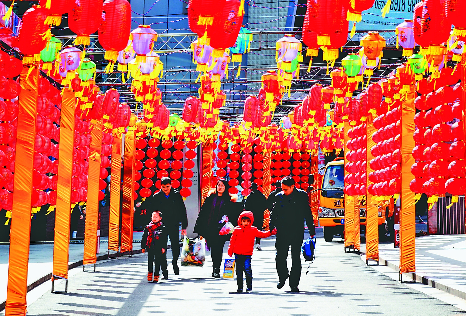 2月7日,市民漫步在挂满花灯的浙江省绍兴街头。新华社发