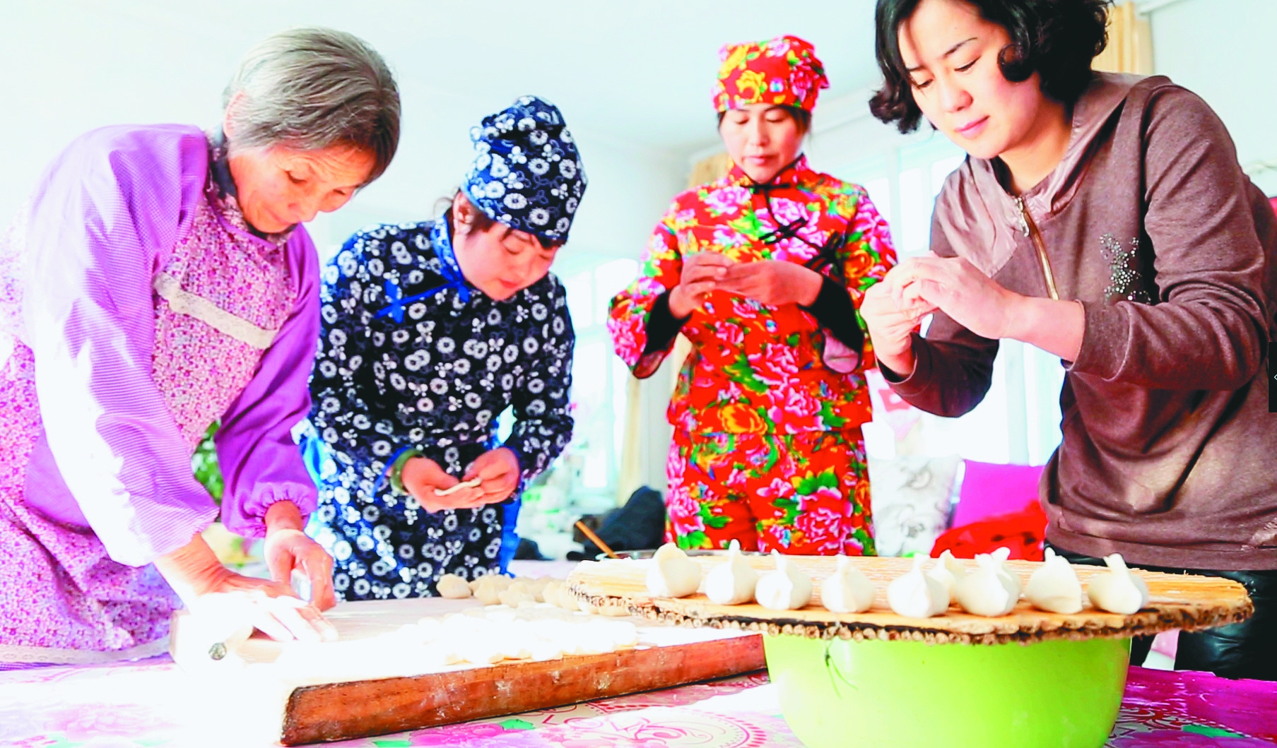 饶河县小南河村第一书记冷菊贞(右一)春节期间和村民一起包饺子。 方海亮摄