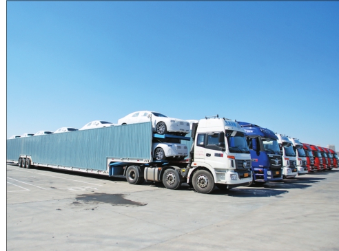 出口美国的沃尔沃轿车专用轿运车车队整装待发。