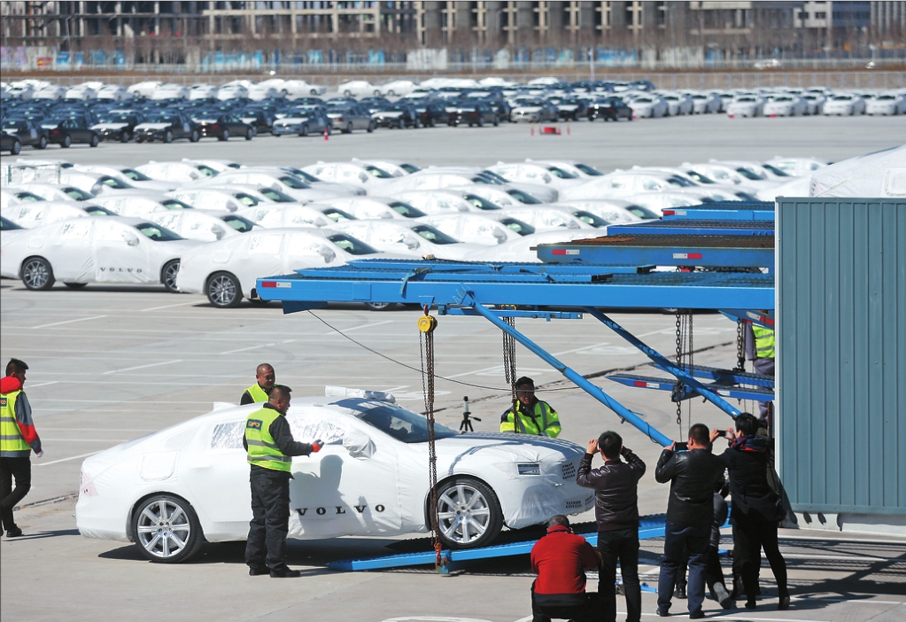 出口美国的沃尔沃S90长轴距版豪华轿车驶入专用轿运车。