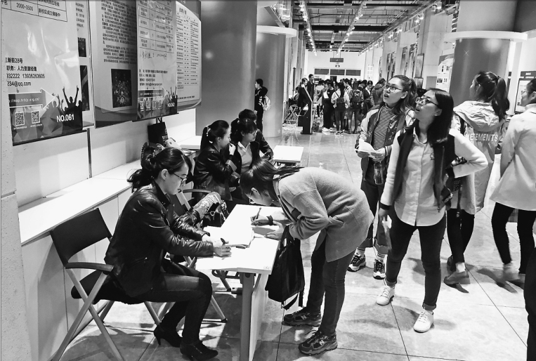 13日,由哈尔滨市人力资源和社会保障局、哈尔滨市教育局主办,哈尔滨市就业管理局、哈尔滨市职业介绍服务中心承办的“2017高校毕业生春季校园招聘会”在哈尔滨人力资源中心举行。活动现场进行了企业招聘以及就业政策宣传咨询,本次招聘会以科技信息企业为招聘主体,同时涵盖商贸服务、装备制造、生物技术、食品加工等适合高校毕业生就业需求的98家企业,提供就业岗位2856余个,签订意向性协议527份。 图为招聘会现场。 本报记者李健摄