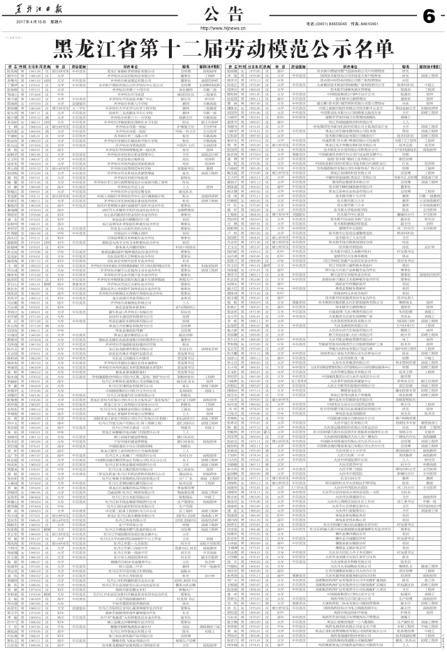 黑龙江省第十二届劳动模范公示名单