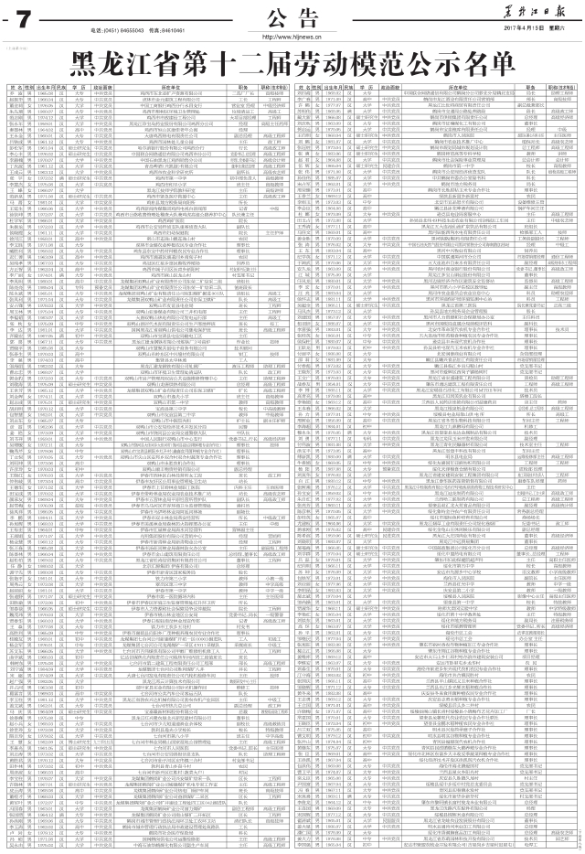黑龙江省第十二届劳动模范公示名单
