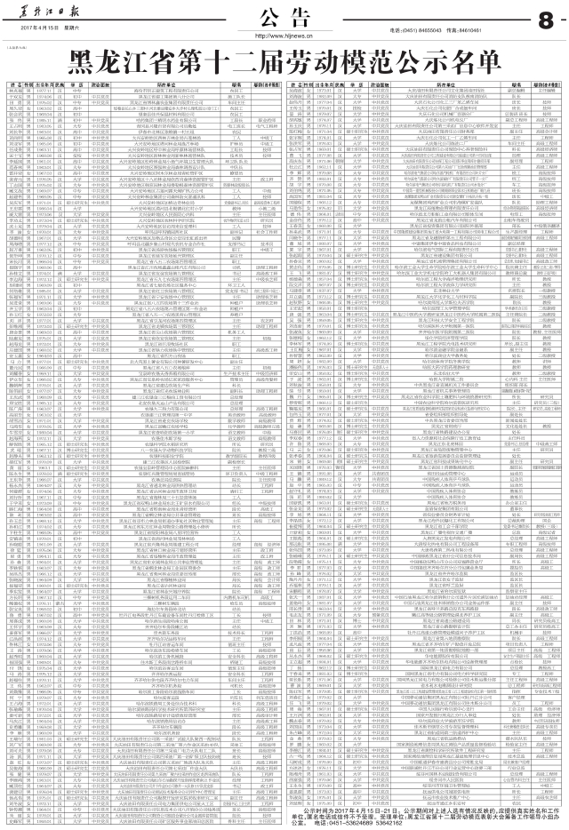 黑龙江省第十二届劳动模范公示名单