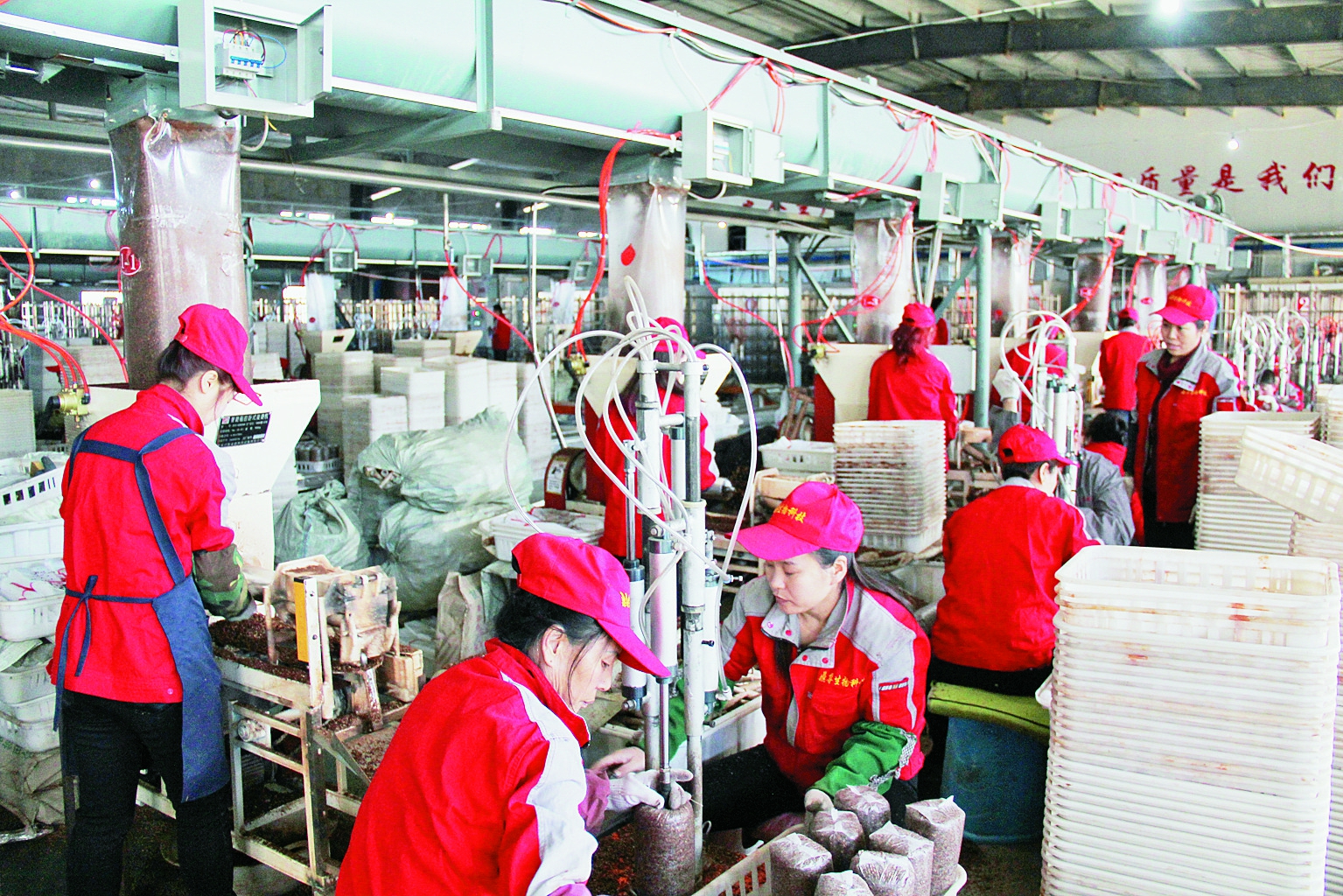 图为灌装车间员工在进行菌包的灌装作业。 孙野摄