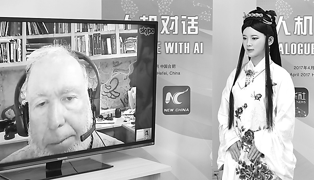当日,由新华社与中国科学技术大学一起在安徽合肥邀请机器人“佳佳”作为新华社特约记者,与美国著名科技观察家凯文·凯利进行人机对话。佳佳是中国科学技术大学“可佳”机器人团队联合国内合作伙伴,历时3年研制出的特有体验交互机器人。 新华社记者郭晨摄