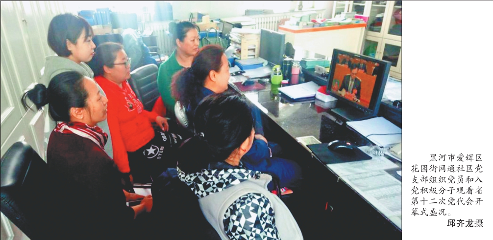 黑河市爱辉区花园街网通社区党支部组织党员和入党积极分子观看省第十二次党代会开幕式盛况。