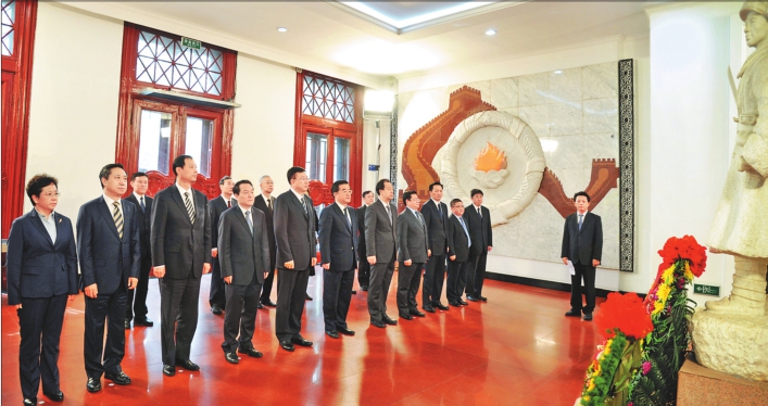 上图:张庆伟率新一届省委常委及部分在哈省委委员向东北烈士纪念馆无名英雄塑像敬献花篮。 徐旭摄
