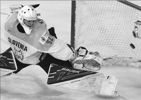 5月10日,斯洛文尼亚队守门员克罗塞列未能挡住芬兰队球员射门。当日,在巴黎举行的2017年世界冰球锦标赛B组比赛中,芬兰队以5比2胜斯洛文尼亚队。新华社发