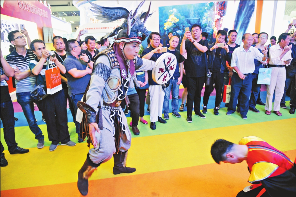 第十三届中国(深圳)国际文化产业博览交易会期间,来自佳木斯演出团体独创的以赫哲族说唱技艺“伊玛堪”和特色萨满舞蹈为主的民族艺术形式亮相文博会,充分展现了龙江文化的独特韵味,每天的表演都吸引了大批参观者驻足观看。图为萨满舞蹈吸引来宾观看。 本报记者郭俊峰摄