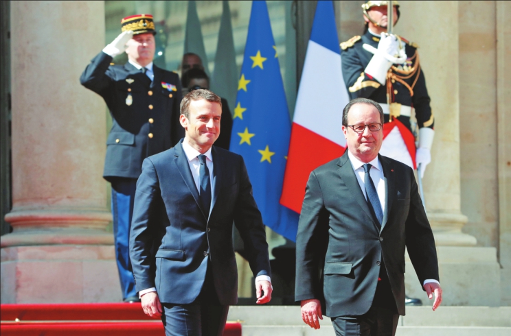据新华社巴黎5月14日电(记者韩冰应强)法国当选总统埃马纽埃尔·马克龙14日与卸任总统弗朗索瓦·奥朗德完成权力交接,正式就任法兰西第五共和国第八位总统。 当地时间14日上午10时(北京时间16时)许,马克龙乘车抵达爱丽舍宫。他与卸任总统奥朗德进行了长达一个多小时的会谈,交接了包括核密码在内的多个重要国家机密事宜。两人会谈结束后,马克龙陪伴奥朗德走向停在红地毯尽头的汽车。在离汽车10余米处,两人久久握手告别,奥朗德对马克龙道声“加油”后登上汽车。随着汽车缓缓驶出爱丽舍宫大门,法国进入“马克龙时代”。 图为5月14日,在法国巴黎爱丽舍宫,当选总统马克龙(左)在权力交接仪式后送别卸任总统奥朗德。 新华社发