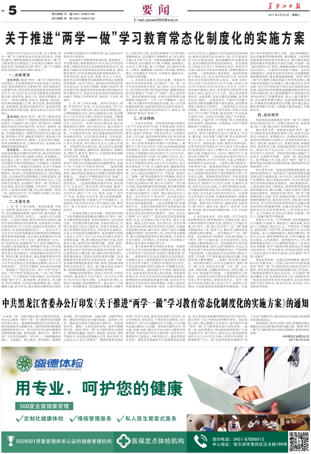 中共黑龙江省委办公厅印发《关于推进“两学一做”学习教育常态化制度化的实施方案》的通知