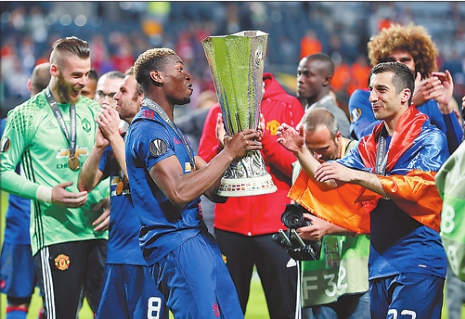 当地时间5月24日,曼联队球员博格巴(前左)和姆希塔良(右)庆祝胜利。当日,在瑞典斯德哥尔摩举行的2016-2017赛季欧罗巴联赛决赛中,英国曼彻斯特联队以2比0战胜荷兰阿贾克斯队,夺得冠军。 新华社发