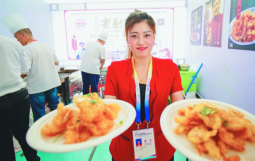 抓糊下锅、翻炸出勺,不到10分钟一盘金黄色的锅包肉就出锅了。在中俄博览会龙菜品鉴会上记者看到,正值饭口,老厨家展台前已排起了长队,每次出锅只能供应五六份,明显供不应求,但排着长队的国外客商很有耐心,好奇地观看着制作全过程。 从海参崴回到哈尔滨参加展会的孙德胜,特地带几家俄罗斯企业的朋友来品尝锅包肉。“我希望让俄罗斯友人尝一尝哈尔滨的特色菜,大家都很喜欢吃,连呼‘哈拉少’!”孙德胜笑着说。罗斯是位澳大利亚参展商,他特意赶来品尝锅包肉。记者说明来意后,他连说OK,还用不太熟练的中文说:“锅包肉,很好吃。” “锅包肉”由“道台府第一厨”郑兴文首创,至今100多年历史。“当时作为北方重镇的府衙,道台府里经常会宴请国外的宾客,尤其是俄罗斯人。因为他们喜食甜酸口味,北方的咸浓口味让他们很不适应。几经冥思的郑兴文把原来咸鲜口味的‘焦炒肉片’,改为甜酸口味的菜肴,这也就是流传至今的锅包肉。”郑兴文第四代传人郑树国告诉记者。 哈尔滨“锅包肉”历来很受外地游客喜爱,很多人到哈尔滨必吃此菜。在本届中俄博览会期间,慕名而来的国内外食客更是络绎不绝。仅“锅包肉”一个菜,每天就卖300份以上。郑树国说,近两年,来自其他国家的客人也越来越多,锅包肉越来越“国际化”了。 工作人员向来宾展示刚出锅的锅包肉。 本报记者刘心杨摄