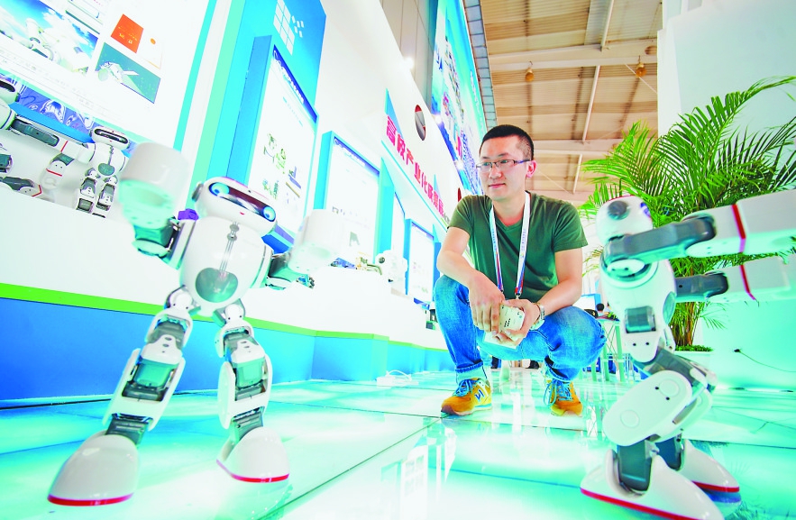 在中俄博览会中俄合作馆及C馆一些展区,形态各异、“怀揣绝技”的机器人,引起了记者的注意,他们有能端菜上桌的小帮手,有“智商”超高的教学担当,还有会十八般武艺的人形机器人。 中俄合作馆及C馆一些展区里,憨厚可爱的机器人“大白”,能交流、能行走、能严密巡逻,据说是国内最先进的服务机器人。在区域振兴展区,可以擦窗、擦地的管家机器人,因性价比颇高,现场一直不知疲倦地进行演示。还有一款教育机器人,名为“能力风暴”,既有像拼图一样拼装出不同形式的机器人,也有早教机,还有一款炫酷的跑车造型机器人,演示起来很拉风。 当然,最吸引眼球的,还是哈尔滨工业大学萝卜立方创业团队的人形机器人,踢腿、劈叉、抖动样样精通,甚至还可以打架子鼓、弹钢琴。该创业团队介绍,这个机器人有专业的名字——DOBI,身高48厘米,体重2.3公斤,有17个仿人类关节,是由40位本硕博学生团队历时一年半自主研发而成的,实现了机器人由“蹲着走”到“站着走”的技术革新,是国内首个具备“被动式拟人步态”的机器人。今年6月3日,他们带着108个机器人在CCTV综合频道《出彩中国人》节目舞台亮相,并在周杰伦《霍元甲》音乐的伴奏下表演起了太极,动作行云流水,受到在场观众的一致称赞。 哈尔滨工业大学萝卜立方创业团队的人形机器人。 本报记者刘心杨摄