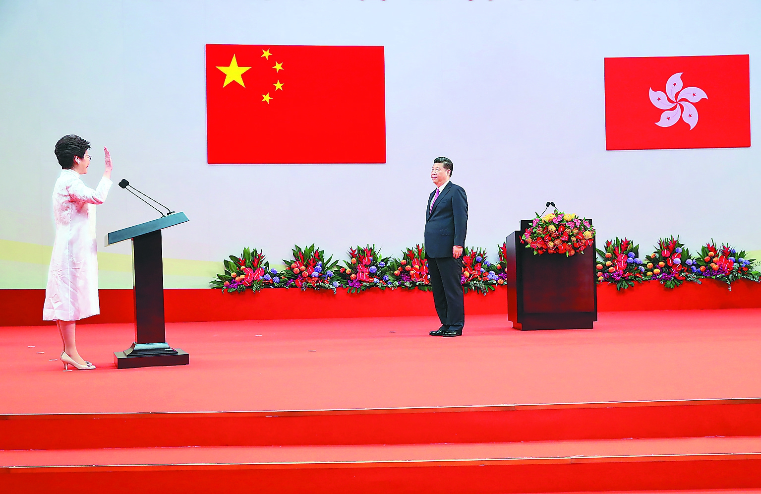 习近平出席并发表重要讲话 新华社香港7月1日电(记者霍小光赵博张晶)庆祝香港回归祖国20周年大会暨香港特别行政区第五届政府就职典礼1日上午在香港会展中心隆重举行。中共中央总书记、国家主席、中央军委主席习近平出席并发表重要讲话。他强调,“一国两制”是中国的一个伟大创举,是中国为国际社会解决类似问题提供的一个新思路新方案,是中华民族为世界和平与发展作出的新贡献,凝结了海纳百川、有容乃大的中国智慧。坚持“一国两制”方针,深入推进“一国两制”实践,符合香港居民利益,符合香港繁荣稳定实际需要,符合国家根本利益,符合全国人民共同意愿。中央贯彻“一国两制”方针坚持两点,一是坚定不移,不会变、不动摇;二是全面准确,确保“一国两制”在香港的实践不走样、不变形,始终沿着正确方向前进。 会场内气氛隆重热烈,高悬的中华人民共和国国旗和香港特别行政区区旗格外醒目。当习近平和夫人彭丽媛在香港特别行政区第五任行政长官林郑月娥和丈夫林兆波陪同下步入会场时,全场起立,热烈鼓掌。 上午9时,庆祝大会暨就职典礼开始。全体起立,高唱中华人民共和国国歌。 习近平走上主席台监誓。林郑月娥首先宣誓就职,她面对中华人民共和国国旗和香港特别行政区区旗,举起右手,依照香港特别行政区基本法的规定庄严宣誓。宣誓完毕,习近平同林郑月娥紧紧握手。 接着,习近平监誓,香港特别行政区第五届政府主要官员在林郑月娥带领下宣誓就职。宣誓完毕,习近平同他们一一握手致意。 随后,林郑月娥监誓,香港特别行政区行政会议成员宣誓就职。 在热烈的掌声中,习近平发表了重要讲话。他指出,香港的命运从来同祖国紧密相连。近代以后,由于封建统治腐败、国力衰弱,中华民族陷入深重苦难。只有当中国共产党领导中国人民经过艰苦卓绝的奋斗赢得民族独立和解放、建立新中国之后,中国人民才真正站立起来,并探索开辟出一条中国特色社会主义光明道路。在改革开放的历史条件和时代背景下,邓小平先生提出了“一国两制”伟大构想,并以此为指引,通过同英国的外交谈判,顺利解决了历史遗留的香港问题。香港回到祖国的怀抱,洗刷了民族百年耻辱,完成了实现祖国完全统一的重要一步。香港回归祖国是彪炳中华民族史册的千秋功业,香港从此走上同祖国共同发展、永不分离的宽广道路。 习近平指出,20年来,“一国两制”在香港的实践取得了举世公认的成功,回到祖国怀抱的香港已经融入中华民族伟大复兴的壮阔征程,继续保持繁荣稳定。作为一项前无古人的开创性事业,“一国两制”需要在实践中不断探索。当前,“一国两制”在香港的实践遇到一些新情况新问题。 (下转第二版) (上接第一版)解决这些问题,满足香港居民对美好生活的期待,继续推动香港各项事业向前发展,归根到底是要坚守方向、踩实步伐,全面准确理解和贯彻“一国两制”方针。 习近平对今后更好在香港落实“一国两制”,提出四点意见:第一,始终准确把握“一国”和“两制”的关系。必须牢固树立“一国”意识,坚守“一国”原则,正确处理特别行政区和中央的关系。任何危害国家主权安全、挑战中央权力和香港特别行政区基本法权威、利用香港对内地进行渗透破坏的活动,都是对底线的触碰,都是绝不能允许的。要把坚持“一国”原则和尊重“两制”差异、维护中央权力和保障香港特别行政区高度自治权、发挥祖国内地坚强后盾作用和提高香港自身竞争力有机结合起来,任何时候都不能偏废。第二,始终依照宪法和基本法办事。要把中央依法行使权力和特别行政区履行主体责任有机结合起来;要完善与基本法实施相关的制度和机制;要加强香港社会特别是公职人员和青少年的宪法和基本法宣传教育。第三,始终聚焦发展这个第一要务。发展是解决香港各种问题的金钥匙。香港背靠祖国、面向世界,有着许多有利发展条件和独特竞争优势。特别是这些年国家的持续快速发展为香港发展提供了难得机遇、不竭动力、广阔空间。大家一定要珍惜机遇、抓住机遇,把主要精力集中到搞建设、谋发展上来。第四,始终维护和谐稳定的社会环境。只有凡事都着眼大局,理性沟通,凝聚共识,才能逐步解决问题。从中央来说,只要爱国爱港,诚心诚意拥护“一国两制”方针和香港特别行政区基本法,不论持什么政见或主张,我们都愿意与之沟通。 习近平指出,当前我国正处在全面建成小康社会决胜阶段,全国各族人民正在为实现“两个一百年”奋斗目标、实现中华民族伟大复兴的中国梦而团结奋斗。不断推进“一国两制”在香港的成功实践,是中国梦的重要组成部分。我们既要把实行社会主义制度的内地建设好,也要把实行资本主义制度的香港建设好。 习近平指出,希望特别行政区政府广泛团结社会各界,全面准确贯彻“一国两制”方针,坚守“一国”之本,善用“两制”之利,扎扎实实做好各项工作。要与时俱进、积极作为,不断提高政府管治水平;要凝神聚力、发挥所长,开辟香港经济发展新天地;要以人为本、纾困解难,着力解决市民关注的经济民生方面的突出问题,切实提高民众获得感和幸福感;要注重教育、加强引导,着力加强对青少年的爱国主义教育,关心、支持、帮助青少年健康成长。中央政府将一如既往支持行政长官和特别行政区