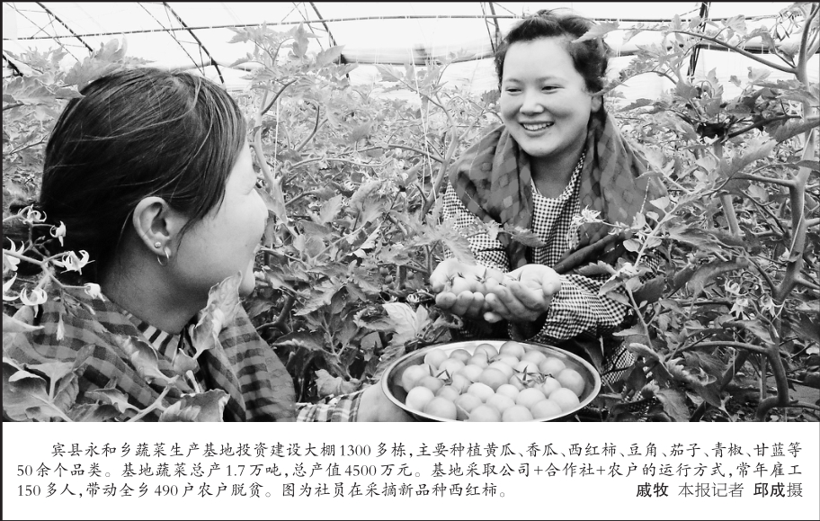 宾县永和乡蔬菜生产基地投资建设大棚1300多栋,主要种植黄瓜、香瓜、西红柿、豆角、茄子、青椒、甘蓝等50余个品类。基地蔬菜总产1.7万吨,总产值4500万元。基地采取公司+合作社+农户的运行方式,常年雇工150多人,带动全乡490户农户脱贫。图为社员在采摘新品种西红柿。 戚牧本报记者邱成摄