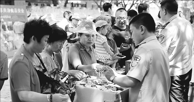 本报讯(余征记者李爱民)3日,哈尔滨市公安机关举行以“尚德守法,共治共享食品安全”、“诚信法制,守护龙江绿”为主题的公安系统食品安全宣传日活动,通过宣传打击涉及食品安全等犯罪的成果和典型案例,营造氛围,震慑犯罪,提高市民防范意识,调动社会力量积极参与打击和防范食品安全犯罪。 活动现场,哈市公安机关采取宣传板展示、咨询台接待、发放传单等多种形式宣传食品安全知识,向群众讲解如何辨别假劣食品、怎样维护消费者权益等基本常识,引导消费者正确消费、安全饮食;发动群众积极举报食品犯罪线索。据统计,活动现场共出动警力300余名,设置展板25块,设咨询台16张,发放资料20000余份,接受现场咨询1600余人次。 图为向市民讲解如何辨别假劣食品。 余征本报记者李爱民摄