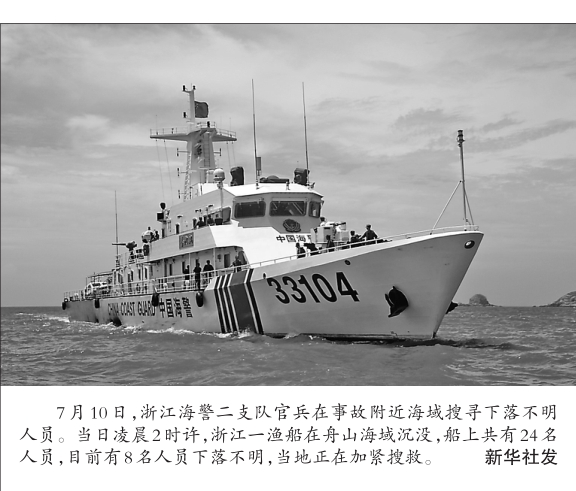 7月10日,浙江海警二支队官兵在事故附近海域搜寻下落不明人员。当日凌晨2时许,浙江一渔船在舟山海域沉没,船上共有24名人员,目前有8名人员下落不明,当地正在加紧搜救。 新华社发