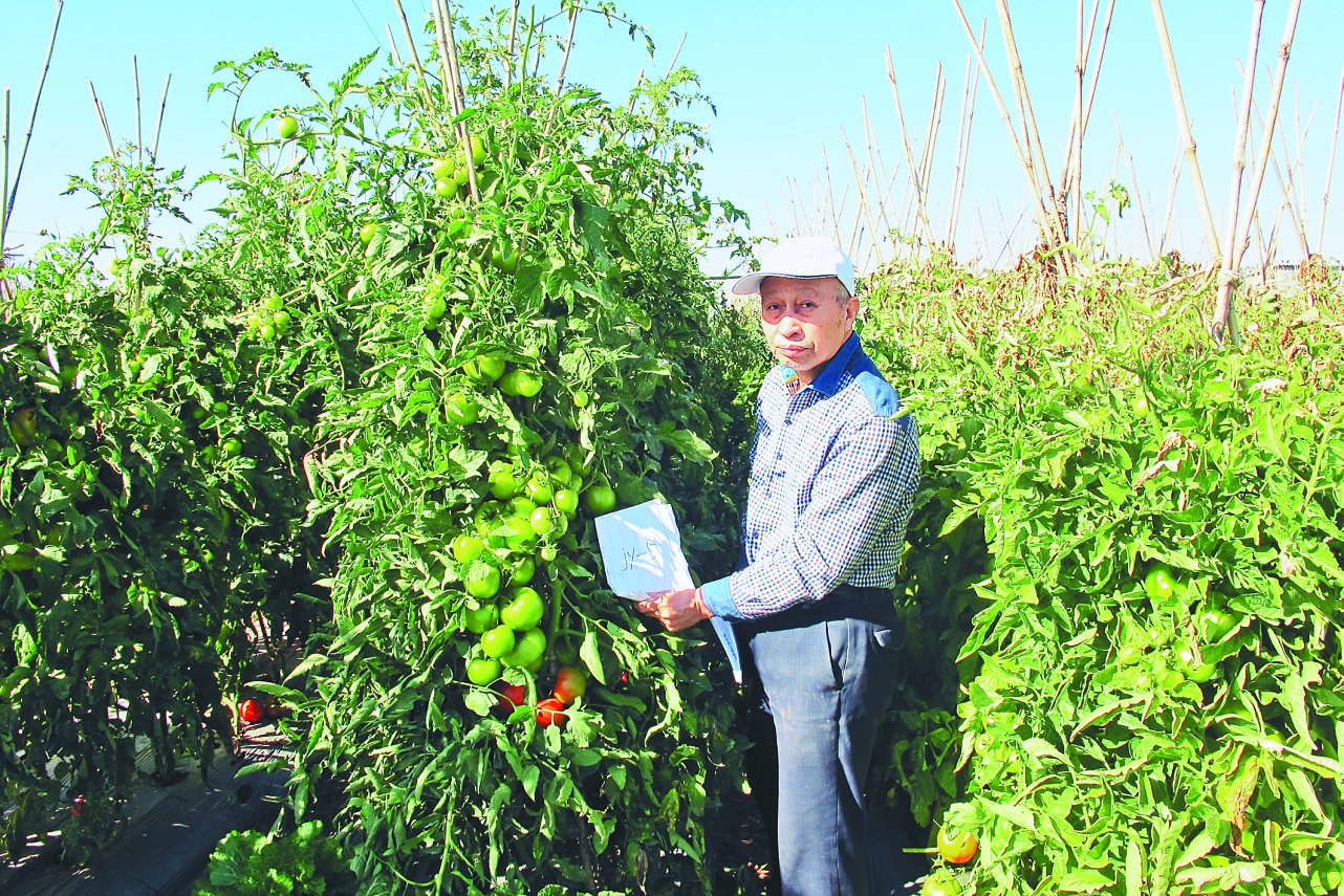 图为李景富在田间查看番茄新品种长势。本报记者马云霄摄