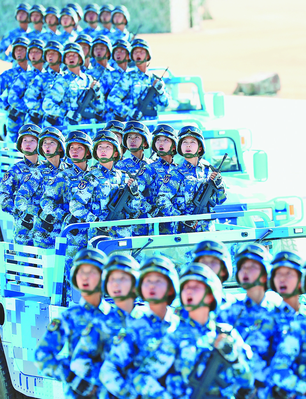 新华社内蒙古朱日和7月31日电(记者王经国梅常伟)庆祝建军90周年阅兵30日在朱日和训练基地举行。阅兵气势磅礴、隆重庄严,无论是阅兵阵容,还是阅兵形式都独具匠心。阅兵集中呈现出的六大亮点,生动展示了人民军队改革强军的崭新风采。 亮点一:政治意蕴深刻厚重 这次阅兵是庆祝建军90周年的一项重大活动,以回顾建军历史、传承红色基因、坚定维护核心、彰显辉煌成就为主题。 这是国防和军队改革全面实施后人民军队的全新亮相,充分表明了这次阅兵深刻的政治意蕴。 新中国成立以来,我军先后举行了以庆祝国庆、纪念中国人民抗日战争暨世界反法西斯战争胜利70周年和庆祝香港回归为主题的阅兵。以庆祝建军节为主题的阅兵在我军历史上还是第一次。 这次阅兵是人民军队整体性革命性改革重塑后的全新亮相,既是对参阅部队军事素养、精神风貌、作风形象的全面检验,也是对强化“四个意识”的现实检验。 亮点二:沙场阅兵“野味”“战味”十足 沙场阅兵将阅兵与部队实战化训练融为一体,设计、编成、流程都充分体现出“野味”“战味”。 这次阅兵依托正在进行实战化训练的部队组织实施。官兵走下训练场、便上阅兵场,以征尘未洗、连续作战的战斗姿态,集结列阵接受检阅。 此外,阅兵场地设在朱日和训练基地,立足实战环境、体现真演实训,打破以往广场阅兵的惯例,不安排徒步方队和踢正步,不安排军乐团、合唱队,不搞群众性观摩。 沙场点兵,军心振奋,使命催征,枕戈待旦。由“礼仪式阅兵”向“打仗式阅兵”的转变,反映了改革强军实施后部队的战斗力,体现了全军官兵在野战化条件下苦练精兵谋打赢的战斗作风,展示了中国军队向世界一流军队奋力进发的宏大气势。 亮点三:阅兵全程体现联合作战特点 从实战出发,根据战斗需求编组,充分体现信息化联合作战特点,是这次阅兵的一大亮点。 阅兵打破原有阅兵单一兵种编组限制,突出反映能打仗、打胜仗要求,按照重在反映现代新型军兵种力量鲜明特色、体现信息化联合作战编成及运用方式的思路,集中体现信息主导、体系支撑、精兵作战、联合制胜特点,充分展示改革后我军体制、结构、格局、面貌的新阵容、新变化、新气象。 在筹划编排上,阅兵按照信息化条件下联合作战要求组织部队行动,采取群队式编组、人装有机结合、空地立体展示的形式,编陆上作战、信息作战、特种作战、防空反导、海上作战、空中作战、综合保障、反恐维稳、战略打击共9个作战群依次受阅,体现了新型军兵种力量混合编组及作战运用的特点。 在受阅方式上进行了精心设计,如特种兵方队30辆全地形车组成箭簇形,体现特种兵箭在弦上、时刻准备战斗的决心。 亮点四:近半参阅装备首次亮相 这次参阅装备达600余台(套),类型多样,涵盖陆军、海军、空军、火箭军、战略支援部队和武警部队等作战力量,而且近一半为首次参阅。 首次亮相的参阅装备中,既有能克服山地、丛林、岸滩、荒漠等多种恶劣地形,并能实现水陆两栖机动的轻型全地形车,也有具备全天候、全高度、超视距、多目标精准打击能力的鹰击-83K空舰导弹;既有助力夺取复杂电磁环境下战场主动权的电子侦察车组,也有能毁瘫敌预警探测、指挥通信体系的新型无人机;既有大型运输机运-20,也有第四代超音速隐身战斗机歼-20……这些列装部队的新型装备,体现了我军现役主战武器装备的信息化水平和部队生成的新质战斗力。 亮点五:“八一”标识“90”字样亮相阅兵式 在分列式上,第二个亮相的纪念标识梯队引人注目。由17架直-19直升机编成的“八一”标识,由24架直-10和直-19直升机混和编成的“90”字样,以低空飞过的方式,完美通过检阅台。 组成“八一”标识、绘出“90”字样参阅,象征着这支走过硝烟、走过风雨,在战火中诞生的光荣之师走过了90年史诗般的壮丽征程。 90载风雨征程,90载成就辉煌。今天的人民军队已经从单一军种发展成为诸军兵种联合、具有一定现代化水平并加快向信息化迈进的强大军队,成为保卫祖国的钢铁长城,成为捍卫正义的和平之盾。 亮点六:火箭军以新军种新形象震撼亮相 战略打击群是阅兵式上“压轴”亮相的作战群。由第二炮兵更名为火箭军的战略导弹部队,带着浓浓的实战化硝烟,以新军种新形象震撼亮相,成为人们关注的焦点。 诞生于1966年的中国战略导弹部队,是我国战略威慑的核心力量、我国大国地位的战略支撑、维护国家安全的重要基石。经过50余年发展壮大,这支部队已成为维护国家安全和世界和平的重要战略力量。 火箭军组成的战略打击群,由火箭军部队方队、核常兼备导弹方队、常规导弹第1方队、常规导弹第2方队、核导弹方队组成,展示的装备代表了当前我军战略导弹部队发展水平,充分展示了我国慑战能战止战胜战的战略制衡能力。 图为海军陆战队方队。 新华社记者琚振华摄