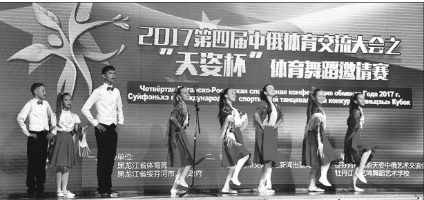 本报讯(尹金婵记者杜怀宇)第四届中俄体育交流大会之“天姿杯”体育舞蹈邀请赛日前在绥芬河市体育馆开幕。 第四届中俄体育交流大会由黑龙江省体育局、绥芬河市人民政府主办,绥芬河市文体广电新闻出版局承办。体育交流项目包括“天姿杯”体育舞蹈邀请赛、中俄武术文化交流活动、射箭比赛、中俄山地自行车邀请赛、篮排乒羽足比赛等赛事。 “天姿杯”体育舞蹈邀请赛由绥芬河市舞韵天姿中俄艺术交流会、牡丹江市艺鸣舞蹈艺术学校、绥芬河市杰出国际旅行社有限公司、绥芬河市凯翔国际旅行社协办,共有300余名选手参赛,其中包括来自俄罗斯阿尔乔姆、符拉迪沃斯托克等4支代表队80人和来自绥芬河、牡丹江、东宁、宁安、海林、八面通、绥阳、鸡西、大庆等13支代表队240人参赛。 图为体育舞蹈邀请赛表演现场。 本报记者杜怀宇摄
