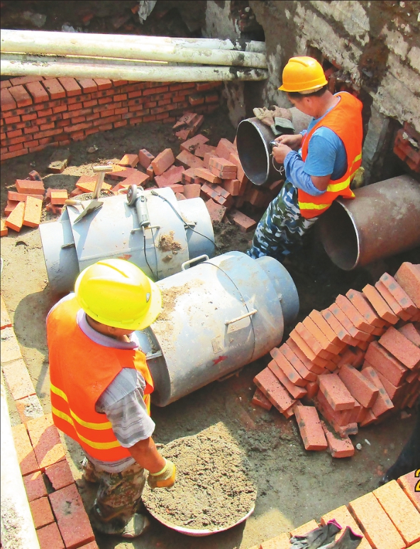 进入夏季,正是供热管网“体检”的最佳时期。在春光巷供热管网施工改造现场大约有40米长的施工地点,有8名裹着长衣长裤、带着安全头盔的工人正在焊接管道。室外的温度已达到摄氏零上35℃,汗水正在不断的从脸颊上流下来。图为春光巷砌阀室施工现场。 陈志伟摄