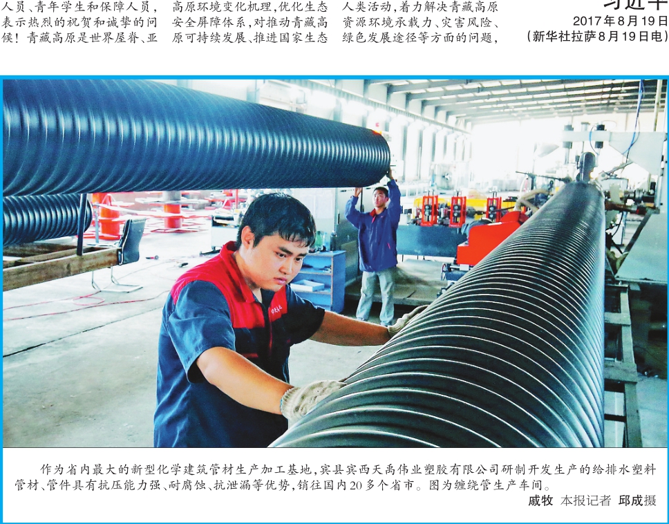 作为省内最大的新型化学建筑管材生产加工基地,宾县宾西天禹伟业塑胶有限公司研制开发生产的给排水塑料管材、管件具有抗压能力强、耐腐蚀、抗泄漏等优势,销往国内20多个省市。图为缠绕管生产车间。