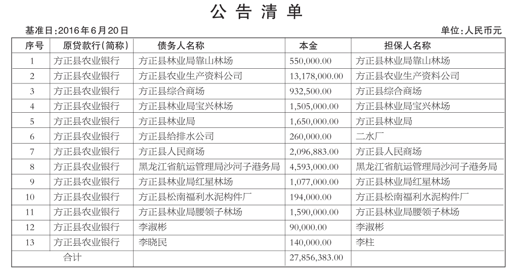 根据中国农业银行股份有限公司黑龙江省分行营业部与方正县人民政府签订的《委托资产批量转让协议》,中国农业银行股份有限公司黑龙江省分行营业部将其对下列借款人及担保人享有的主债权及担保合同项下的全部权利,依法转让给方正县人民政府。中国农业银行股份有限公司黑龙江省分行营业部特此公告通知各借款人及担保人。 方正县人民政府作为上述债权的受让方,现公告要求下列债务人及其担保人,从公告之日起立即向方正县人民政府履行借款合同及担保合同约定的还本付息(诉讼费)义务或相应的担保责任。 注:1、本合同清单仅列示截止到2016年6月20日的本金余额,借款人和担保人应予偿还的利息余额按借款合同、担保合同及中国人民银行的有关规定计算(单位:人民币元、外币美元)。 2、若债务人、担保人因各种原因更名、改制、歇业、吊销营业执照或丧失民事主体资格的,请相关承债主体及/或主管部门代为向方正县人民政府履行义务或履行清偿责任。 3、方正县人民政府地址:方正县团结路134号 联系人:陶继富 电话:0451-57123165特此公告。 中国农业银行股份有限公司黑龙江省分行营业部方正县人民政府2017年5月22日