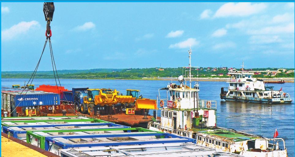 在黑河港货运码头,塔吊正在紧张作业,中俄轮渡过货船只往来穿梭,一片繁忙景象。黑河港今年明水期主要出口货物以卷板、机械及建材类物资为主,进口以袋装大豆、集装箱载大豆、灌装大豆油及板材为主。目前货运量同比增长134.3%,港口吞吐量同比增长139.3%,进出口集装箱同比增长140%。 邱齐龙本报记者邵国良摄