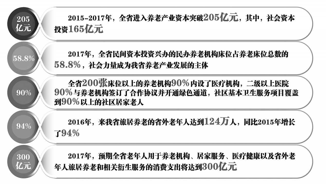 □张永元杨洋本报记者郭铭华 随着我省经济形势稳中向好,各行业都在摆脱资源依赖、挖掘新的经济增长点上持续发力。2016年以来,第三产业特别是现代服务业在我省经济结构中的比重不断增加,增加值占GDP权重达53.7%。养老服务业作为现代服务业的重要组成部分,展现出前所未有的活力和旺盛需求,据测算,2015年至2017年,全省进入养老产业资本突破205亿元,其中,社会资本投资165亿元。 省委省政府高度重视我省养老服务业发展,并将其提升到全省发展战略层面全力推进。去年以来,通过转变思想观念、放开市场准入、吸引社会资本、盘活闲置资产、强化宣传推介等手段,我省已经成功打造“旅居养老、医养结合养老、互联网+养老、社区居家养老、文化养老”和“连锁分布、服务外包、渠道分销、集成销售、垂直营销”的“5+5”发展模式,成功进行了养老服务业改革的初步“试水”,并在2016年落实国家重大政策措施考核中,以“落实养老服务业支持政策积极主动、养老服务体系建设成效明显”的工作成绩受到国家有关部门肯定。 养老产业发展没有现成的模式可以照搬,我省正在用渐进式改革的方式,在实践中不断探索,在发展中不断修正。如何厘清思路,让我省养老服务业加速迈进改革的快车道?如何让全省人民在改革中切身受益?如何通过养老服务业的蓬勃发展带动整个养老产业全领域的转型升级?按照省委省政府的部署,最近成立的全省养老产业体制改革专项小组已经提出了具体路径。 科学谋划改革“蓝本”为养老产业发展“定调” “养老产业设计领域十分广泛,横向比较各省发展现状,我省在老年产品用品开发、老年教育、养老金融、养老地产、生命科技等方面投资发展潜力巨大,2017年,预期全省老年人用于养老机构、居家服务、医疗健康以及省外老年人旅居养老和相关衍生服务的消费支出将达到300亿元。因此抢抓养老服务业发展机遇,推动我省养老体制改革势在必行。”这是省民政厅副厅长魏峰对我省养老产业发展形势给出的判断。 近日,省委养老产业体制改革专项小组审议通过了《全省养老产业改革工作意见》,为当前和今后养老产业体制改革提供了指导性“蓝本”。文件围绕建立完善社会养老服务体系、发展养老服务产业、提升养老院服务质量、广泛开展居家养老服务、创新养老服务“医养”融合机制、创新“候鸟式”养老机制、打造全国竞争性养老领导品牌七大方面,提出了改革总体思路和26项重点任务。 较之以往,我省此次改革思路体现出五个特点:一是更加注重运用多种营销手段。努力整合推介、直邮、会展、促销、广告乃至公关等不同营销手段,广泛宣传推介哈尔滨市安康福利院服务理念和管理模式,宣传天鹅颐养联盟专营最舒适、最惬意的夏季旅居养老,宣传我省整体生态化优势。二是更加注重资源整合和效能的提升。今后,养老产业发展要与健康、旅游产业紧密结合,整合资源实现共享,特别是在推进候鸟养老产业发展的同时拓展冬季冰雪旅游、全域旅游市场,突出服务资源的整体推进。三是鼓励引导养老地产健康发展。引导盘活全省房地产市场闲置地产项目,整体打包设计进行适老化改造后引进养老投资;鼓励养老地产托管公司开展代租、代管业务,实现冬季有效利用,拉动外部旅居、旅游消费的同时,吸引消费者由租房到买房,消化闲置地产。四是将养老产业与特色小镇发展密切结合。今后在我省11个国家级特色小镇的整体发展规划中,要更加突出文化、旅游、新生业态发展,充实城镇化功能,侧重与养老产业相结合。要以养老为主线,拉动其他产业发展,实现相对集中、规模化发展的消费服务业态。五是将农村养老纳入工作推进的重中之重。要求各层面都要加大农村养老公共服务设施建设力度,探索推广农村幸福院互助服务、农村集体经济资产运营收益支持本村老年人养老保障、农村老年人以社会服务贡献积分换服务等模式和经验,推动农村养老服务供给水平大幅提升。 倾力刻画三个品牌领跑国内养老市场 “我们要抓住既有龙江特色又有市场需求的养老产业,找准我省的差异化优势,才能在养老产业领域继续抢占全国领先地位。目前,我省养老产业改革已经找到三个切入点,即:追求一流服务品质、瞄准居家养老主流需求、占领大数据信息资源高地。”省民政厅副厅长魏峰如是介绍。 下一步,我省将继续在整合线上线下资源、养老事业单位转企、居家养老连锁等点位上率先寻求突破,将努力把“哈尔滨安康”、“天鹅颐养联盟”和“黑龙江福寿阁”打造成全国养老行业三大领导品牌,带动整个养老产业的蓬勃发展。 一是打造“天鹅颐养联盟”候鸟旅居养老品牌。2016年,来我省旅居养老的省外老年人达到124万人,同比2015年增长94%。为了更好对接快速增长的异地旅居养老需求,我省创建了“天鹅颐养联盟”,目前已经拥有全国会员300多家,平台线下企业150多家,并且产品定位精准、市场细分明确、具备较强的市场竞争力。未来,推进“天鹅颐养联盟”企业化改革是实现平台壮大发展、发挥更大社会效益和经济效益的必由之路。通过打造“天鹅颐养联盟”领导品牌,进一步提升养老产品营销水平,使“夏季养老在龙江”由一个宣传口号变为常识性认知。开发平台手机APP客户端、VR虚拟现实技术的应用,提升现场体验感,