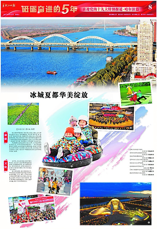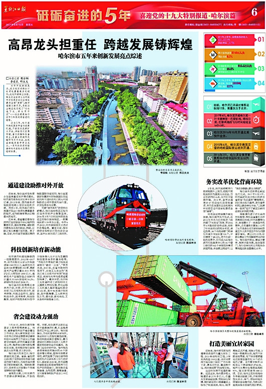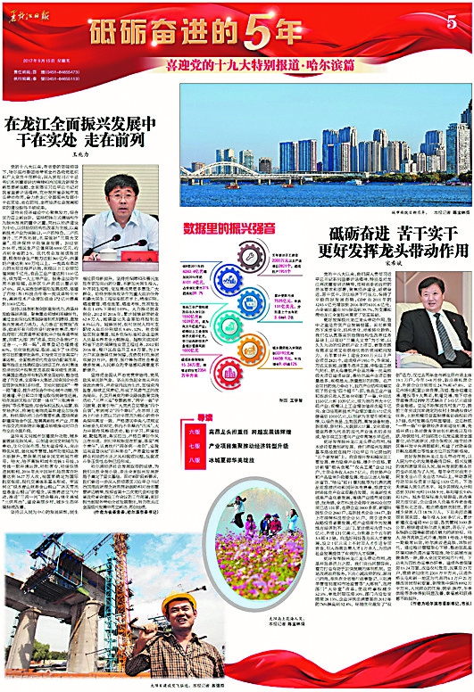 本报讯(记者张长虹)过去五年,在省委省政府的正确领导下,黑龙江3800万人民深入学习贯彻习近平总书记系列重要讲话精神和对我省重要讲话精神,撸起袖子加油干,取得了有目共睹的辉煌成绩。为全面充分展示党的十八大以来我省在经济社会发展各个领域取得的成就,为党的十九大胜利召开营造浓厚舆论氛围,本报从15日起陆续推出“砥砺奋进的五年·喜迎党的十九大特别报道”。 这组特别报道紧紧围绕习近平总书记系列重要讲话精神,特别是对我省重要讲话精神;紧紧围绕省第十二次党代会精神和工作部署;紧紧围绕党的十八大以来,各地各行业统筹推进“五位一体”总体布局和协调推进“四个全面”战略布局,充分展示我省十三个地市以及农垦、森工、铁路和大庆油田,在经济建设、政治建设、文化建设、社会建设、生态文明建设中取得的重大成果。通过大格局小切口、图文并茂的鲜活报道,与读者一起书写“美丽中国”的龙江画卷,与读者一起见证黑土地上为实现“两个一百年”奋斗目标和中华民族伟大复兴中国梦的生动实践。 15日首先推出“砥砺奋进的五年·喜迎党的十九大特别报道·哈尔滨篇”,详见5~8版。