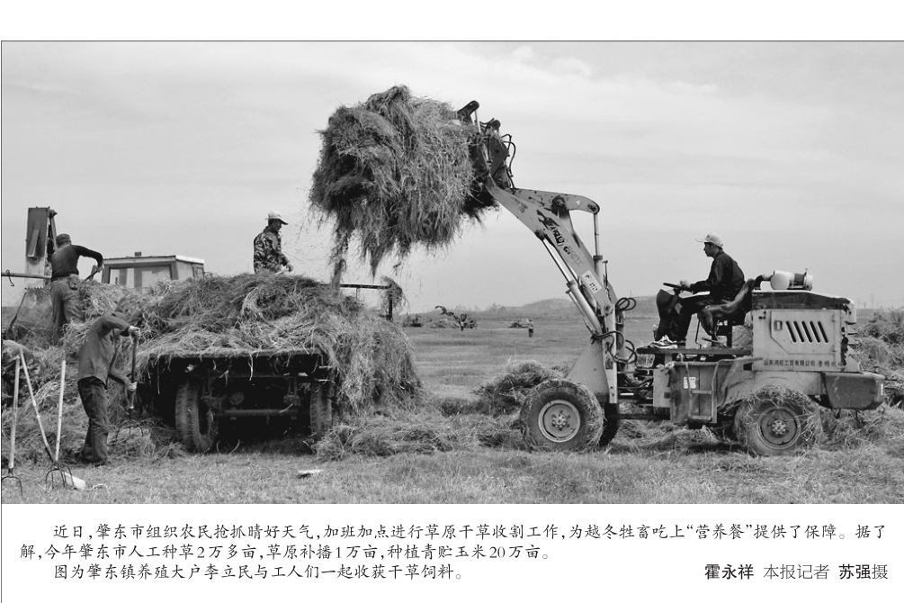 近日,肇东市组织农民抢抓晴好天气,加班加点进行草原干草收割工作,为越冬牲畜吃上“营养餐”提供了保障。据了解,今年肇东市人工种草2万多亩,草原补播1万亩,种植青贮玉米20万亩。 图为肇东镇养殖大户李立民与工人们一起收获干草饲料。 霍永祥本报记者苏强摄