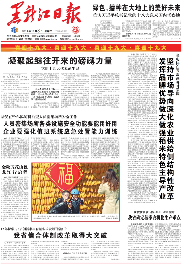 本报2日讯(记者曹忠义)2日,就深化农业供给侧结构性改革、抓好“粮头食尾”“农头工尾”工作,省委书记、省人大常委会主任张庆伟到五常市调研。他首先向辛勤工作在一线的全省广大农业工作者、生产者致以节日的问候,强调要深入贯彻落实习近平总书记重要讲话精神和省十二次党代会精神,坚持市场导向,不断深化农业供给侧结构性改革,持续抓好“粮头食尾”“农头工尾”,推动产业多元化发展,打造提升品牌,做大做强稻米特色主导产业。 秋日的五常,稻菽飘香,一派丰收景象。张庆伟首先来到卫国乡东方粮仓农业高科技示范园区育苗基地,考察水稻浸种、催芽、育秧等情况。他强调,要坚持绿色发展,严格各环节标准,搞好污水排放,保护好这一方水土,实现可持续发展。张庆伟随后来到五常市国家现代农业示范区水稻核心区,现场查看水稻收割和秋翻现场,了解新型经营主体和土地流转情况,询问今年收成如何、气温影响大不大、有几种收割方式等,他还挥镰收割,和农民一起感受丰收的喜悦。在五常市金福泰农业股份有限公司,张庆伟参观了稻米文化馆,考察稻米存储、加工车间和成品库。他叮嘱企业负责人,要牢记使命、追求卓越,努力创最好企业、做行业标杆。他强调,大米是我国重要的口粮,五常大米是中国大米的代表,要在产业发展上做出示范、走在前列。工商、质监、粮食等部门要加强协调配合,共同努力,带动全省稻米产业更好更快发展,当好维护国家粮食安全的“压舱石”。 调研期间,张庆伟主持召开座谈会,听取五常市工作汇报。他强调,要注重发展优势特色产业。坚持以市场为导向调整种植结构,扩大中高端绿色有机农产品供给。发挥优势做大做强稻米加工业,提高稻米加工层次和水平,成为富民强市产业。要深入落实习近平总书记关于黑龙江要发展好稻米产业的重要指示,形成专项方案加快推进。强化多元支撑推动产业发展,加强与哈尔滨新区对接,承接产业转移,深度挖掘稻乡文化、山水文化资源,促进文化与旅游深度融合。 张庆伟强调,要注重加强品牌建设。强化品牌整合,不断提升品牌内涵,坚决打击利用外地稻米加工冒充五常大米现象,提升产品核心竞争力。抓好质量提升,把提高水稻品质作为重点,提升标准化生产能力,靠质量安全占领市场、畅销全国。搞好营销推介,加快旗舰店、体验店建设,推动线上线下同步营销,平台和品牌相互促进、共同发展。 张庆伟强调,要注重发挥新型农业经营主体作用。积极发展现代农机等各类合作社,不断提升生产经营水平和辐射带动能力,大力引进工商资本,引导龙头企业完善风险共担、利益共享的利益联结机制,鼓励种养大户通过传帮带、示范引领、产业联营等方式,提升农业产业价值链,促进农民在产品增值中增收致富,实现共享发展,实现全面小康。大力发展农业社会化服务组织,加强涉农金融工作,把涉农贷款利率降下来,解决好农业降成本问题。 张庆伟强调,要注重保障和改善民生。脱贫攻坚是必须打赢的一场硬仗,是重大的政治任务,是第一民生工程,要确保如期完成脱贫攻坚任务。新农村建设是党中央的重大战略决策,要把农村社会建设、乡村治理作为头等大事,遵循乡村自身发展规律,保留乡村风貌,留得住青山绿水,记得住乡愁。 张庆伟强调,农村工作千头万绪,要抓好基层党组织建设,持续开展作风整顿活动,推动农村基层党组织和党员干部转变作风,提高服务群众能力和水平。 省领导张雨浦、王兆力、吕维峰,省直有关部门主要负责同志参加调研和座谈。