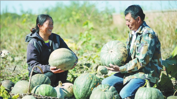 近日,龙江县景星镇北沟村曹忠全夫妇在田间喜滋滋地收获白瓜。今年他们种植100多亩白瓜,每亩预计能生产出75公斤白瓜子,纯收入近十万元。 黄洋本报记者姚建平摄