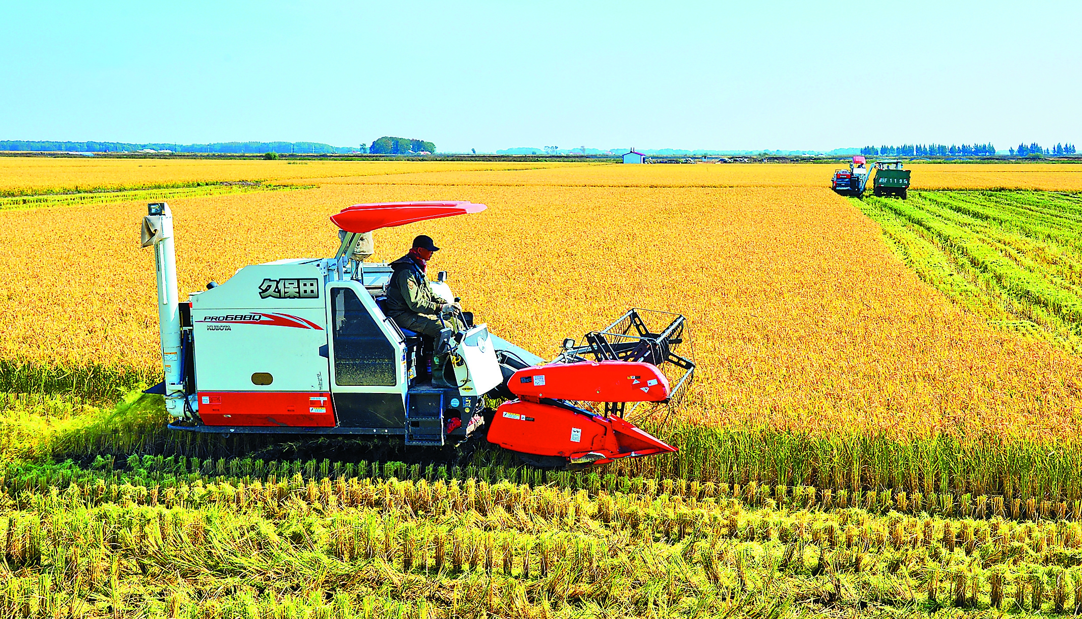 ②八五六农场的稻田里收割机在作业。 本报记者陈宝林摄