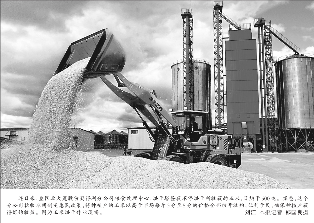 连日来,垦区北大荒股份勤得利分公司粮食处理中心,烘干塔昼夜不停烘干新收获的玉米,日烘干500吨。据悉,这个分公司秋收期间制定惠民政策,将种植户的玉米以高于市场每斤3分至5分的价格全部敞开收购,让利于民,确保种植户获得好的收益。图为玉米烘干作业现场。 刘江本报记者邵国良摄