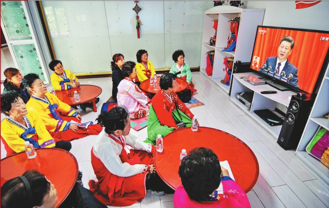 10月18日,牡丹江市西安区牡丹朝鲜族街道办事处,阿妈妮读报组的老人们,聚在一起收看中国共产党第十九次全国代表大会开幕直播。 张春祥本报记者邵国良摄