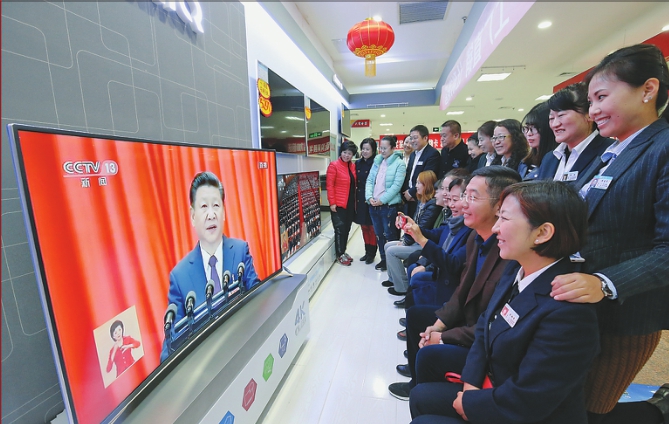 10月18日上午,市民在哈尔滨新一百家电商场收看中国共产党第十九次全国代表大会开幕盛况,聆听大会报告。 本报记者邱成摄