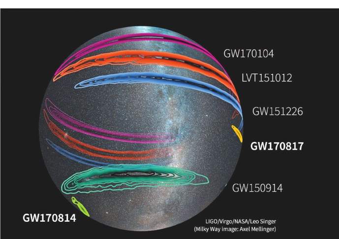 目前探测到的5次引力波空间定位比较图,黄色部分是最新的引力波GW170817确定的引力波源所在的区域。