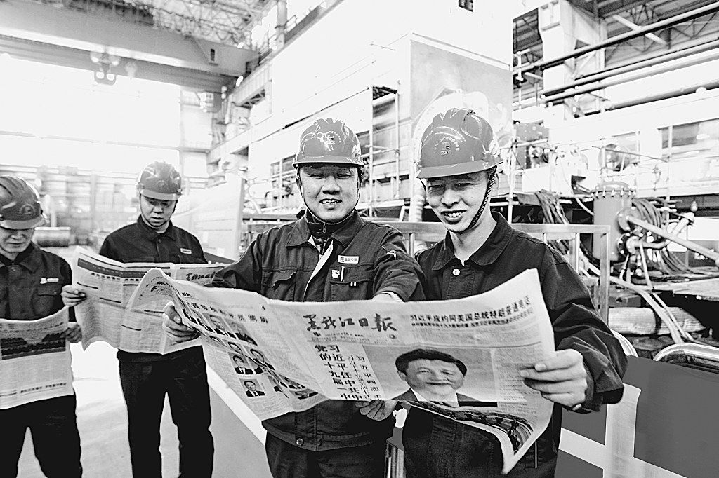 日前,在哈电集团哈尔滨电机厂有限责任公司的车间内,工人们利用休息时间找来相关材料学习党的十九大精神。大家纷纷表示,十九大报告提出要弘扬劳模精神和工匠精神,让大家备感振奋,一定要努力工作,再创佳绩。