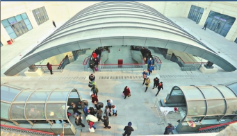 旅客从下沉广场乘坐扶梯出站