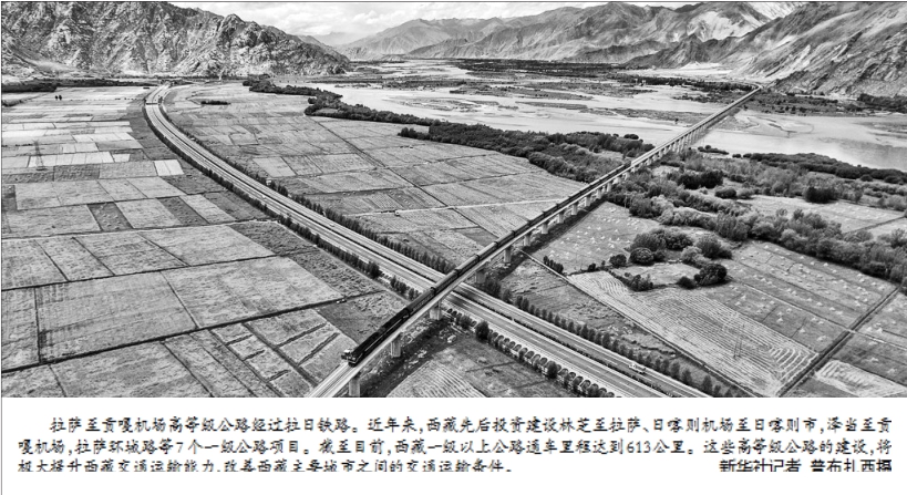 拉萨至贡嘎机场高等级公路经过拉日铁路。近年来,西藏先后投资建设林芝至拉萨、日喀则机场至日喀则市,泽当至贡嘎机场,拉萨环城路等7个一级公路项目。截至目前,西藏一级以上公路通车里程达到613公里。这些高等级公路的建设,将极大提升西藏交通运输能力,改善西藏主要城市之间的交通运输条件。 新华社记者普布扎西摄