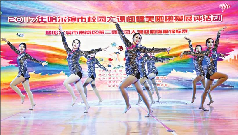 近日,“2017年哈尔滨市校园大课间健美操、啦啦操展评活动暨哈尔滨市南岗区第二届校园大课间啦啦操锦标赛”在黑龙江大学体育馆举行。当天,来自哈尔滨市各区私立幼儿园、小学、初中、高中、中职中专在籍在校2180余名学生参与到校园大课间啦啦操示范套路、校园大课间自编啦啦操、健身操等项目的展示和角逐。图为啦啦操锦标赛现场。 吴迎本报记者邢汉夫摄