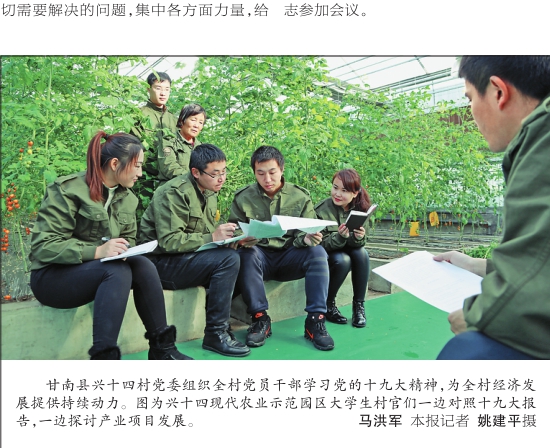 甘南县兴十四村党委组织全村党员干部学习党的十九大精神,为全村经济发展提供持续动力。图为兴十四现代农业示范园区大学生村官们一边对照十九大报告,一边探讨产业项目发展。 马洪军本报记者姚建平摄