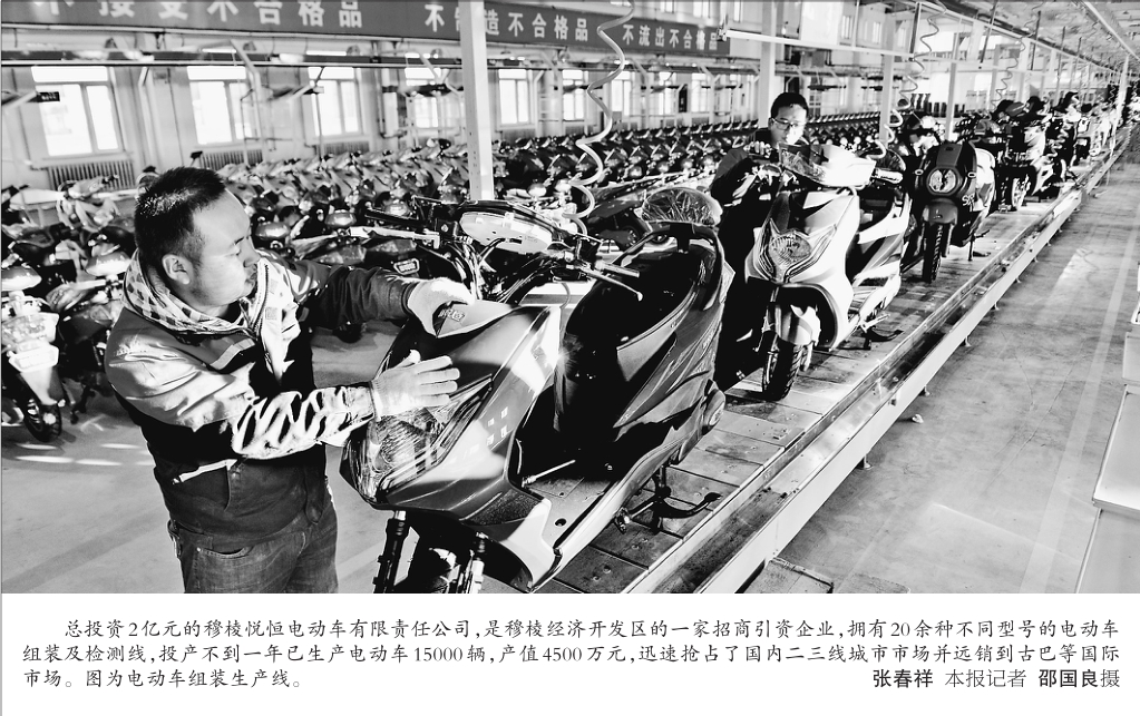 总投资2亿元的穆棱悦恒电动车有限责任公司,是穆棱经济开发区的一家招商引资企业,拥有20余种不同型号的电动车组装及检测线,投产不到一年已生产电动车15000辆,产值4500万元,迅速抢占了国内二三线城市市场并远销到古巴等国际市场。图为电动车组装生产线。 张春祥本报记者邵国良摄