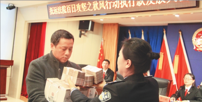 本报讯(唐海鸥记者刘亿服)日前,在抚远市人民法院会议室内,前来领钱的人排起了长队,这是法院正在为当事人集中发放执行款。 在这次执行款发放活动中,最高兴的是王某,因为自己追缴6年无果的200多万元欠款,在这一天终于失而复得。几年来,被这笔债务困扰的压力曾经几度让他对生活失去信心,法院受理他的案件后,多方调查、走访,寻找案件的突破点,经过办案人员的努力,仅用时两周便帮他追回了这笔欠款。接过这笔欠款,王某非常激动,又让他重新看到了生活的希望。 同王某一样,领回自己欠款的20多名当事人,同样是被债权债务纠纷困扰多年,通过诉讼维权,在法院的帮助下,使问题得到彻底解决。 据了解,抚远市人民法院根据最高人民法院关于“用两到三年时间基本解决执行难问题”的总体部署,由一把手亲自带队,开展了“百日攻坚”执行专项活动,集中清理挂牌督办和涉特殊主体执行案件、一年以上未结执行案件、终结本次执行程序案件、执行信访案件。活动开展以来,办案人员加班加点,多措并举,积极办理。 截至目前,受案标的额7250万元,已结案总标的额3101.6192万元,已结案到位标的累计1340万元,实际直结率达43%。 执行款发放现场。 唐海鸥摄