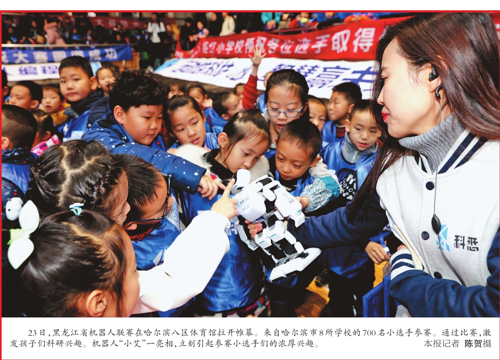 23日,黑龙江省机器人联赛在哈尔滨八区体育馆拉开帷幕。来自哈尔滨市8所学校的700名小选手参赛。通过比赛,激发孩子们科研兴趣。机器人“小艾”一亮相,立刻引起参赛小选手们的浓厚兴趣。 本报记者陈贺摄